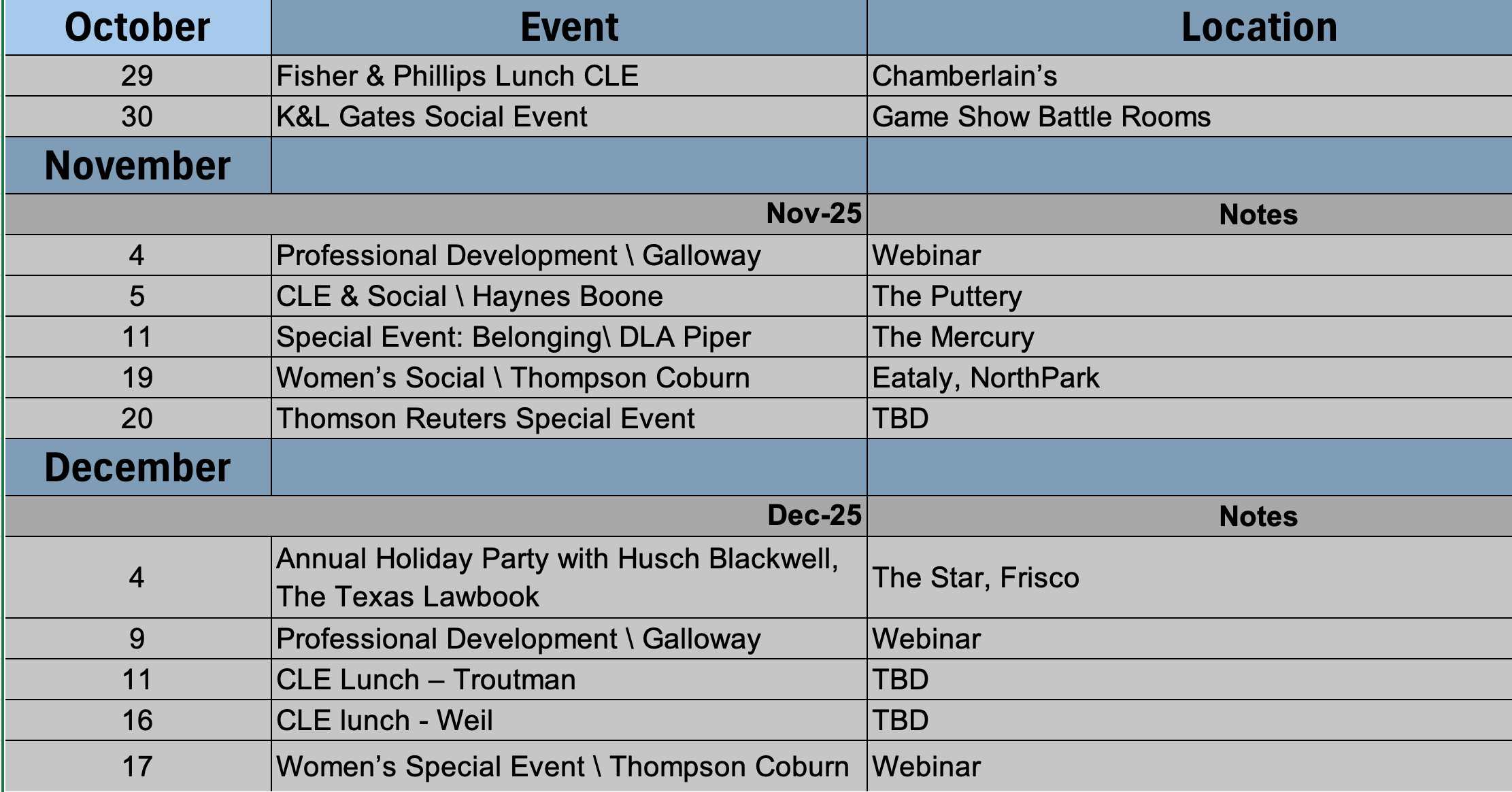 We continue to be excited and ready for the fall with expanded programming and an amazing group of both tenured and new sponsors. Thanks to the combined effort and commitment of both our membership and our sponsors, we continue to be the center of in-house activity in the Dallas-Fort Worth Metroplex. The Chapter provides timely and relevant training and development, networking, pro bono and community events. With over 1100 members, the DFW Chapter is experiencing tremendous growth and is committed to delivering value to its members and their companies. We invite you to explore our website and to attend our events. Please contact any of our Officers or Board members, or our Executive Director, if you have any questions.