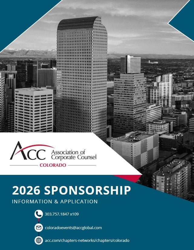 Strategic sponsorship: ACC Colorado offers sponsors the opportunity to imagine unique networking events, presentation topics, panelists, and presentation formats that may lead to long term networking and business relationships with ACC Colorado members.