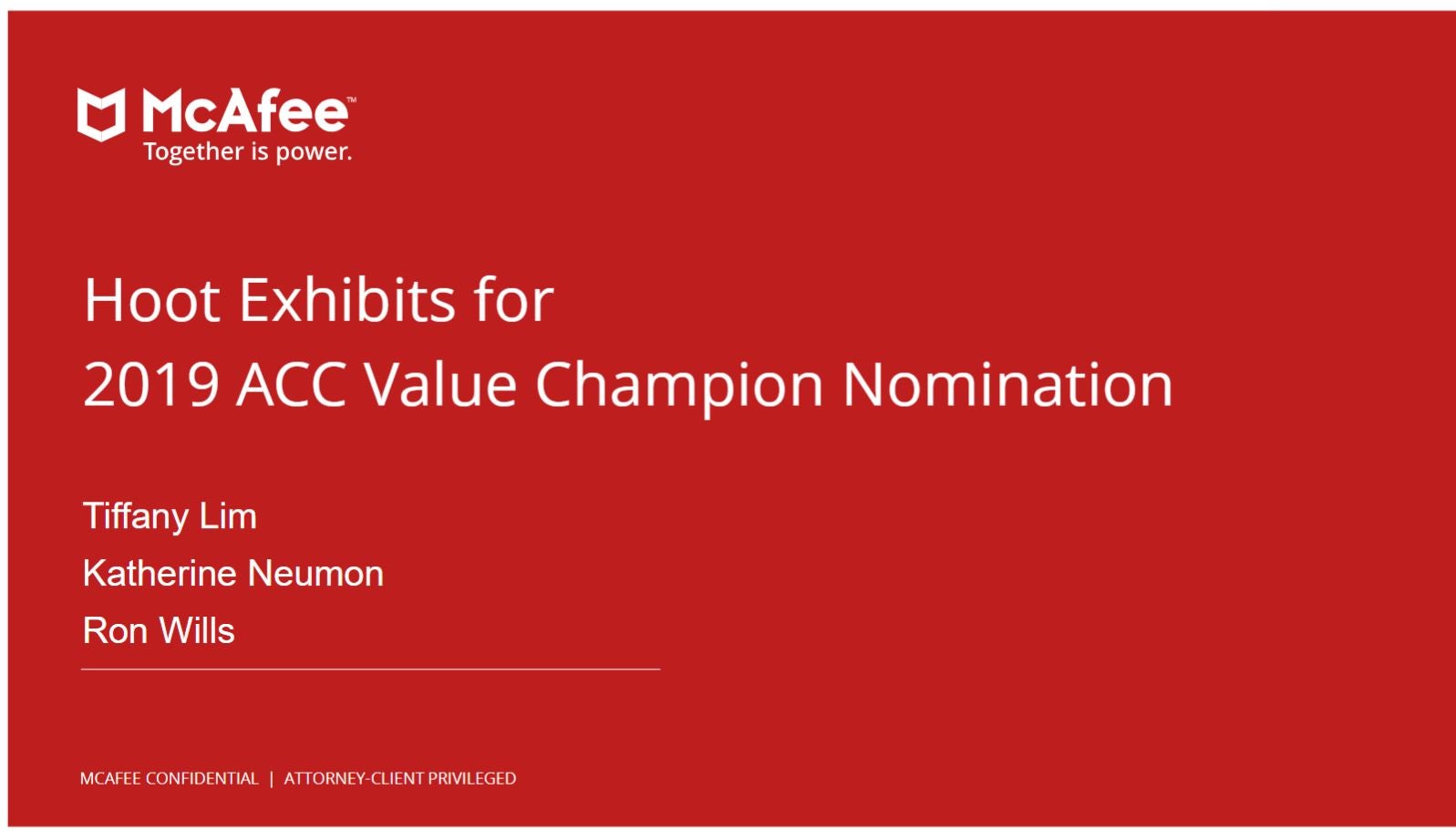 Costs have declined as well—by more than 60 percent. These savings are generated mostly by the minimization of outside counsel fees.  In 2017, McAfee spent 100% of the budget allocated for outside counsel support for product and marketing reviews.  In 2018, that outside counsel spend dropped to 18 percent within the allocated budget. Best of all, “Hoot has been positive for the view of the legal department within the company. It’s a lot easier for everyone to come together,” says Neumon.
