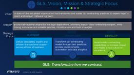Utilizing the data from the workstream analysis, Legal built a business justification that influenced the strategic decision to create a new internal transactional team of contract managers, known as Global Legal Services (GLS). GLS is a state-of-the-art global team that will transform and scale its contracting practices to expand Legal’s reach and support VMware’s growth. “This team serves as the transactional engine for Legal, providing best-in-class contracting support, while driving innovative and scalable process, infrastructure, and tools strategies,” says Jackie Davis, VP, Commercial Legal Group.