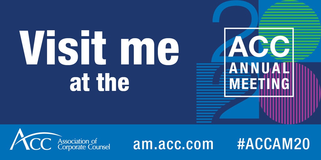 Let your peers, audience, or potential customers know that you will be at the world's largest gathering of in-house counsel! Use one of the below messages, or craft your own, in your social media posts. To use one of the images, right-click to copy or save the image to your computer, and paste or upload the image as needed.