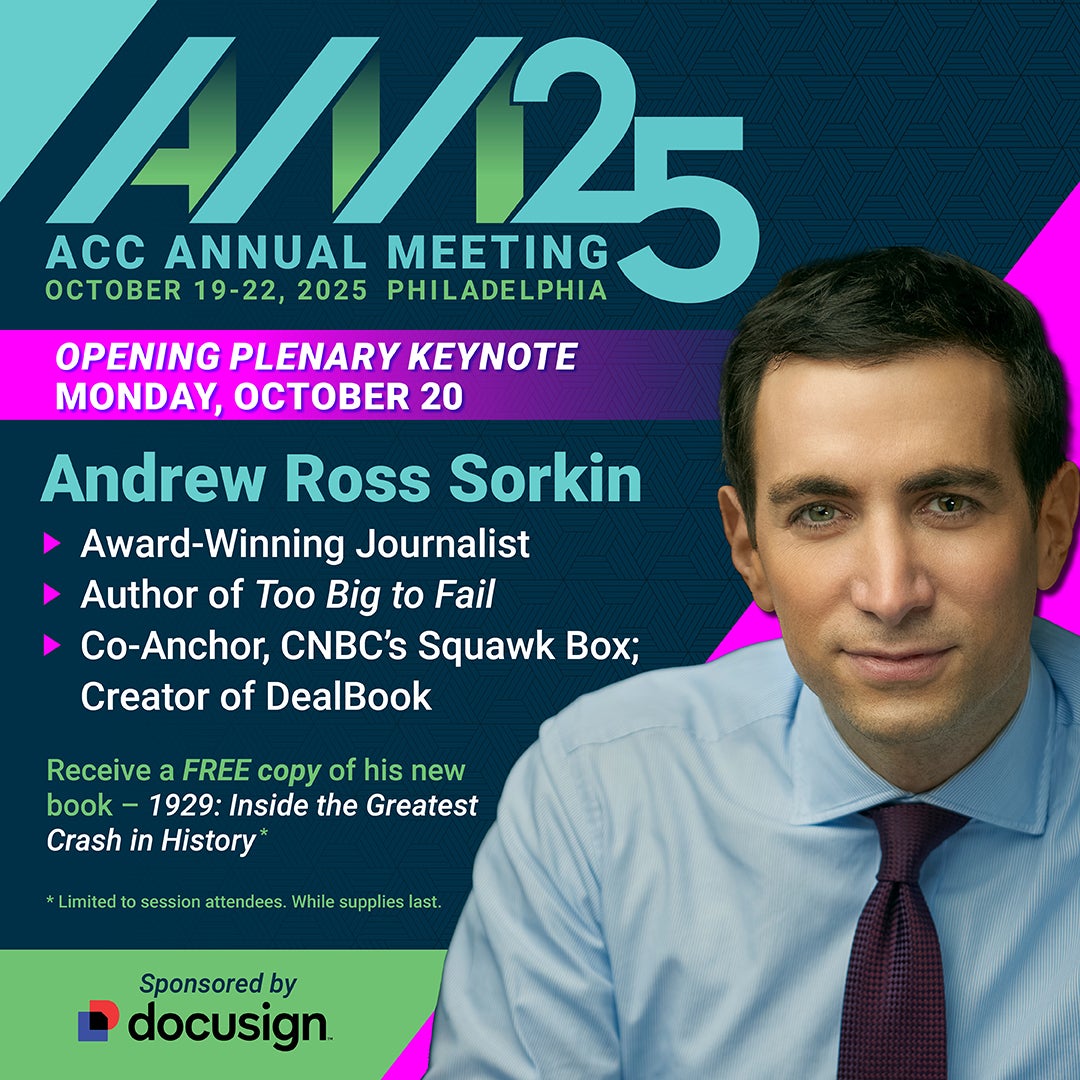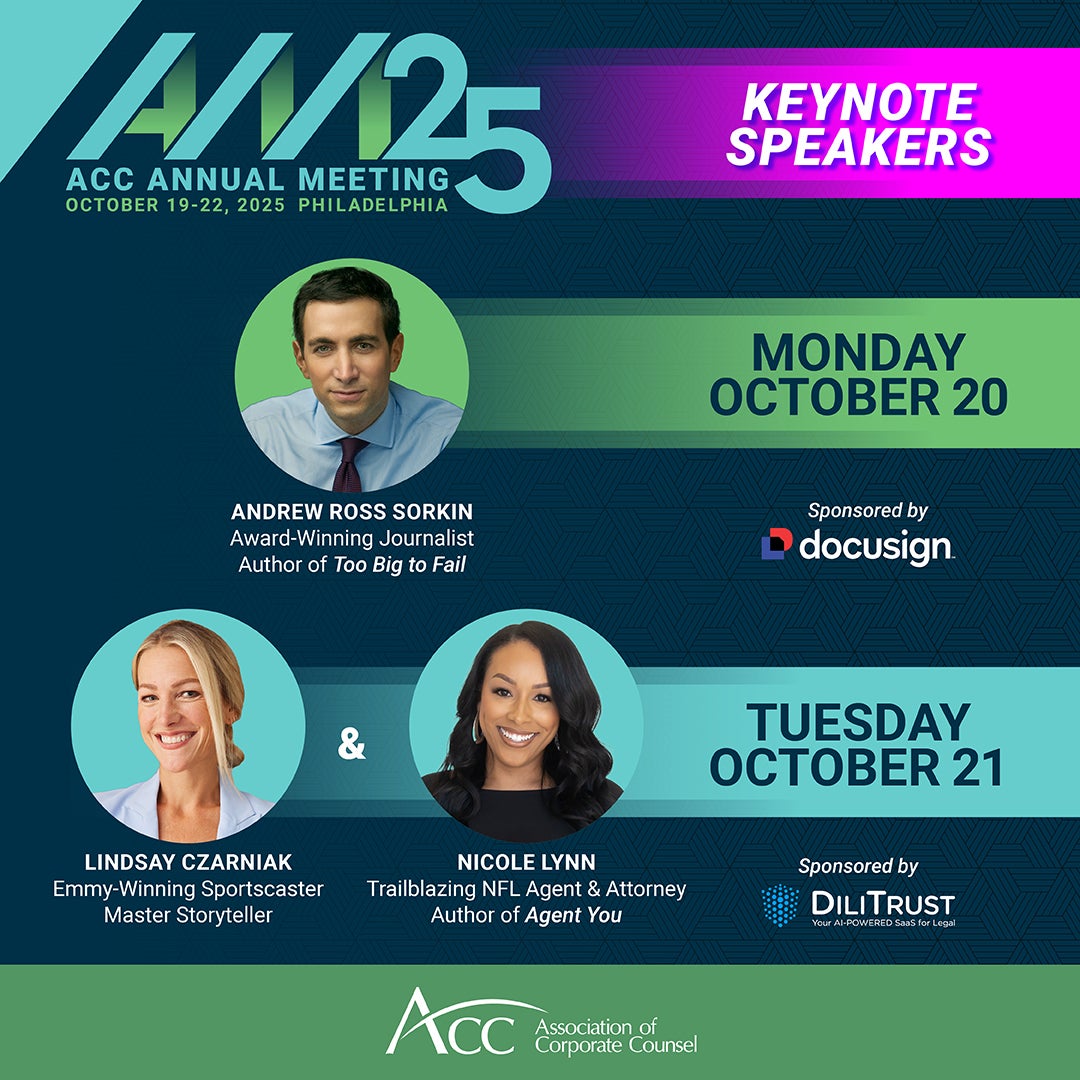 This year's speakers include in-house counsel and legal operations professionals from companies such as American Airlines, Amtrak, Chevron, Comcast, DocuSign, Dr. Bronner's, Gallup, Garmin, GlaxoSmithKline, Google, Habitat for Humanity, Johnson & Johnson, Mastercard, McDonald's, Mercado Libre, Meta Platforms, Morton Salt, Nasdaq, Nationwide, Sallie Mae Bank, Sargento Foods, State Farm, Travelers, Under Armour, United Airlines, World Central Kitchen, Workday, and more