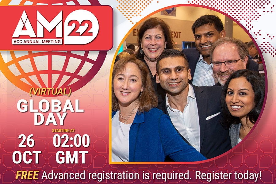 Global Day is an around-the-clock single day of virtual programming on 26 October 2022 focusing on topics of universal importance to in-house legal professionals worldwide and allowing participants to cross borders without leaving the comfort of their homes! Topics include leadership, career development, law department management, global compliance, and Diversity, Equity, and Inclusion (DEI). The event is free and is open to everyone – delegates do not have to be ACC members to attend.