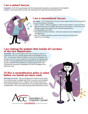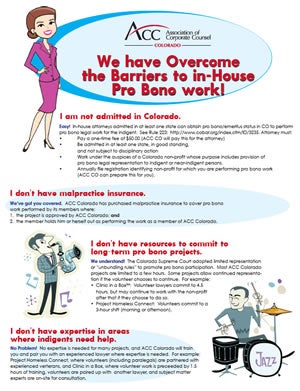 Good News! ACC Colorado has purchased malpractice insurance to cover its members who perform pro bono work under the auspices of ACC Colorado. The work must be (1) for a project that has been approved by ACC Colorado (all of the projects listed on this page are approved); (2) you must hold yourself out as performing the work as a member of ACC Colorado; and (3) you must submit an ACC Colorado Pro Bono Engagement Letter, signed by your pro bono client, to coloradoevents@accglobal.com.
