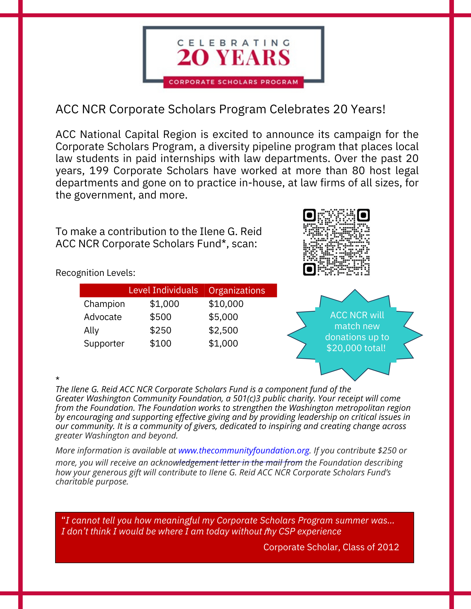 Recipients will be announced in May and featured in promotional materials for and during ACC NCR’s Corporate Counsel Awards Reception on July 16, at Westwood Country Club, Vienna, VA.