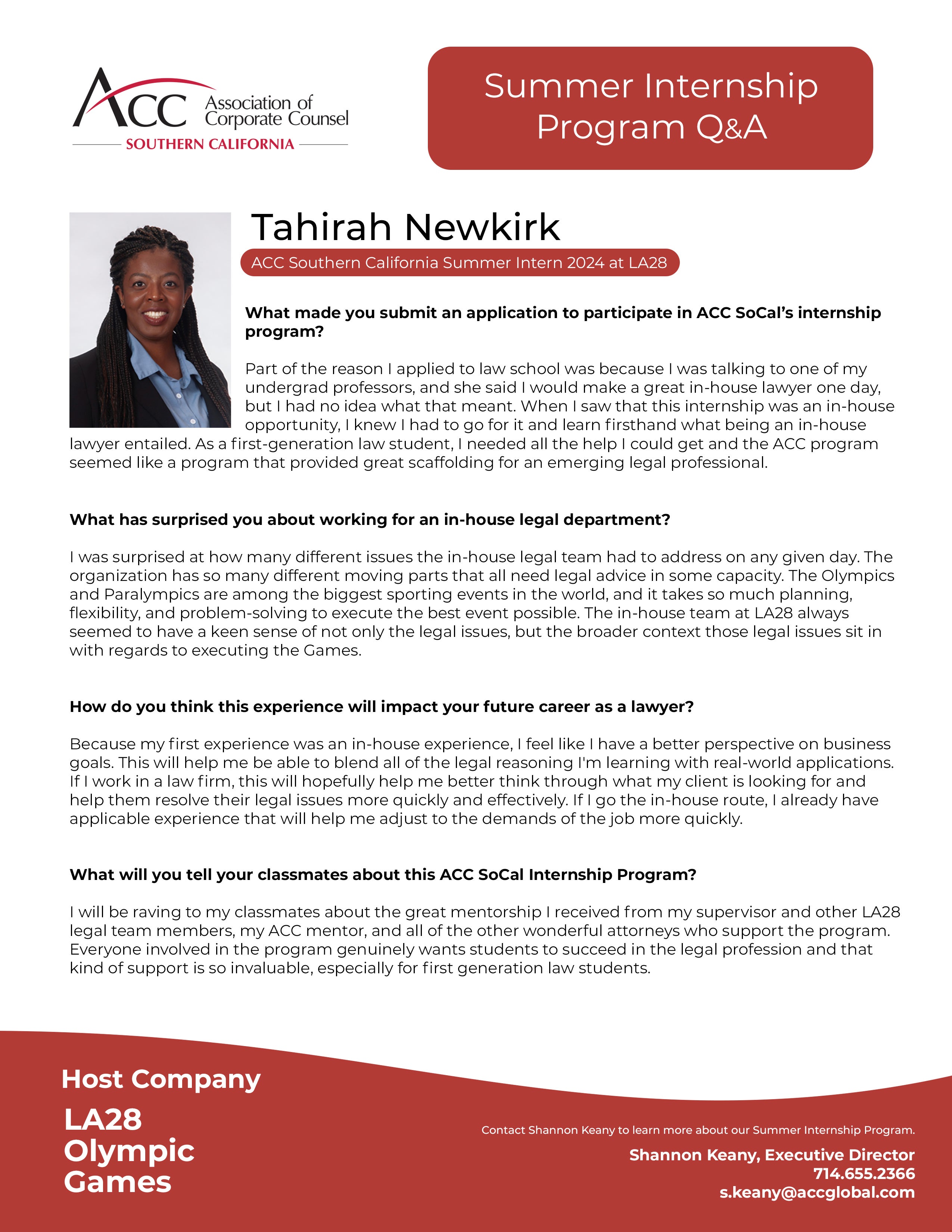 Now in its 6th year, the ACCess Internship Program offers a select group of students immersive internships within corporate legal departments in Southern California. The ACC Southern California Chapter is seeking students who have shown a commitment to increasing the representation of various backgrounds and identities within the legal profession or within their community.