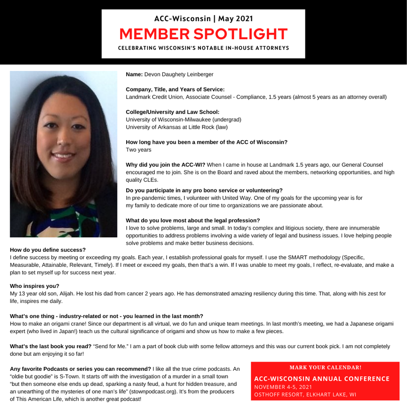 How long have you been a member of the ACC of Wisconsin? Why did you join the ACC-WI? I have been a member of the ACC since 2015 when I first went in-house. The other in-house lawyers there encouraged me to join, and I'm very glad I listened to them.
