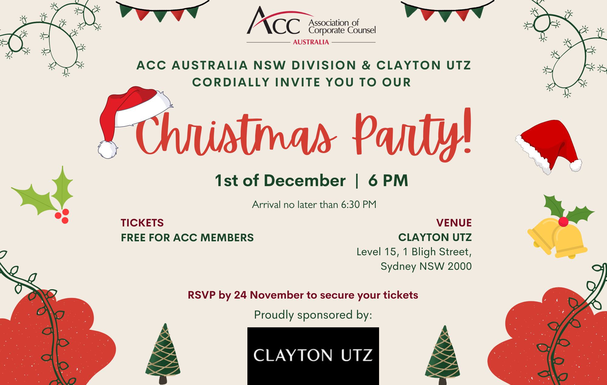 ACC AustraliaThe ACC Australia NSW Division Committee in partnership with Clayton Utz warmly invite you to put your Santa hat on and join us in our Annual Christmas Party!
