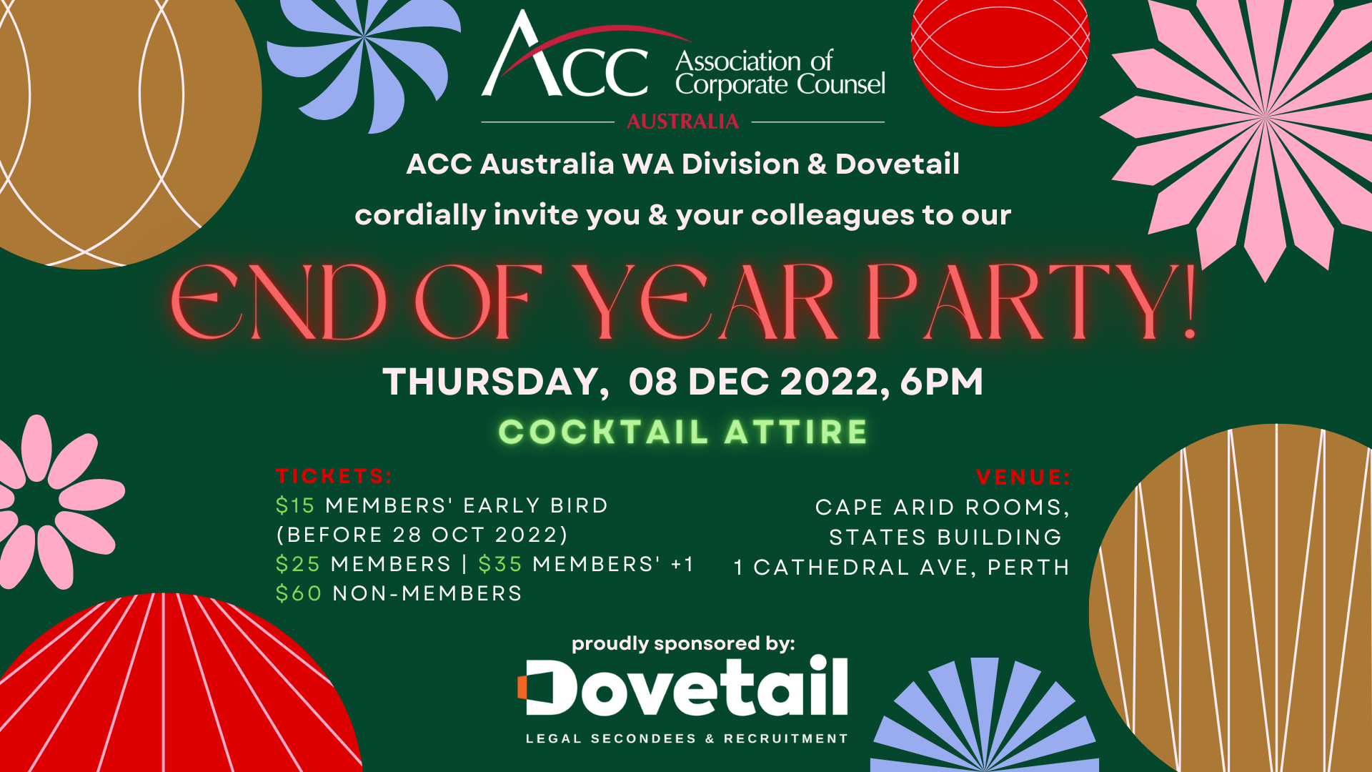ACC AustraliaCome join the ACC Australia WA Division Committee and Dovetail to celebrate the end of 2022 and what a year it has been for in-house teams! We look forward to seeing you together with your colleagues and plus-ones to take pause and reflect on the amazing achievements you have made in 2022 and get ready for new challenges in 2023!