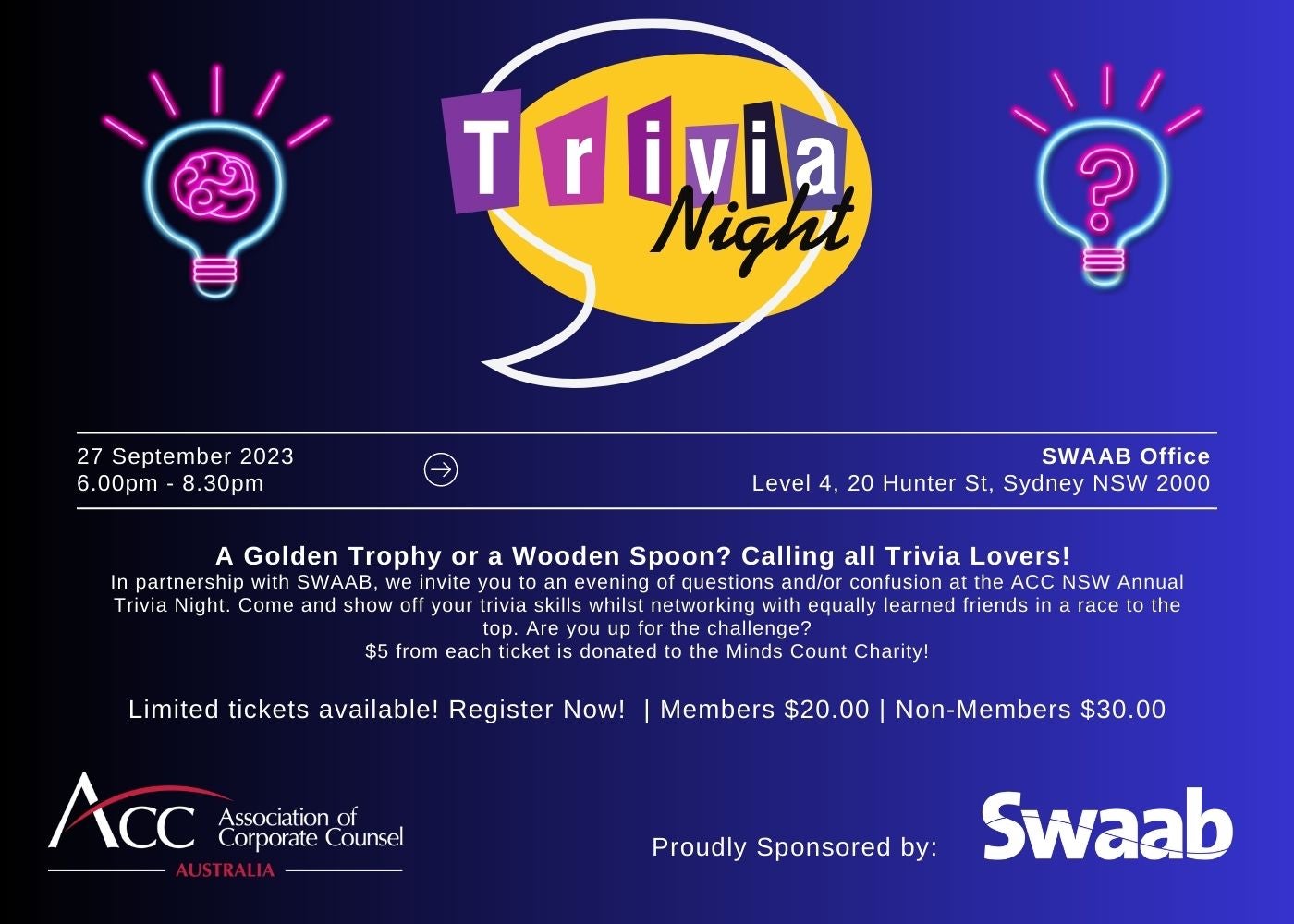 In partnership with SWAAB Lawyers, we invite you to an evening of questions and/or confusion at the ACC NSW Annual Trivia Night.