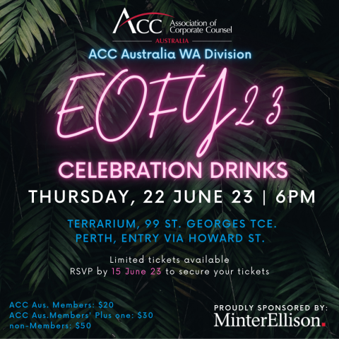 ACC AustraliaGet ready to let loose and celebrate the end of the financial year with your favourite in-house friends and colleagues! Join us for an unforgettable evening at Terrarium, Perth's hottest new bar, where you can bask in the warm glow of great company, delicious canapes, and tantalising drinks.