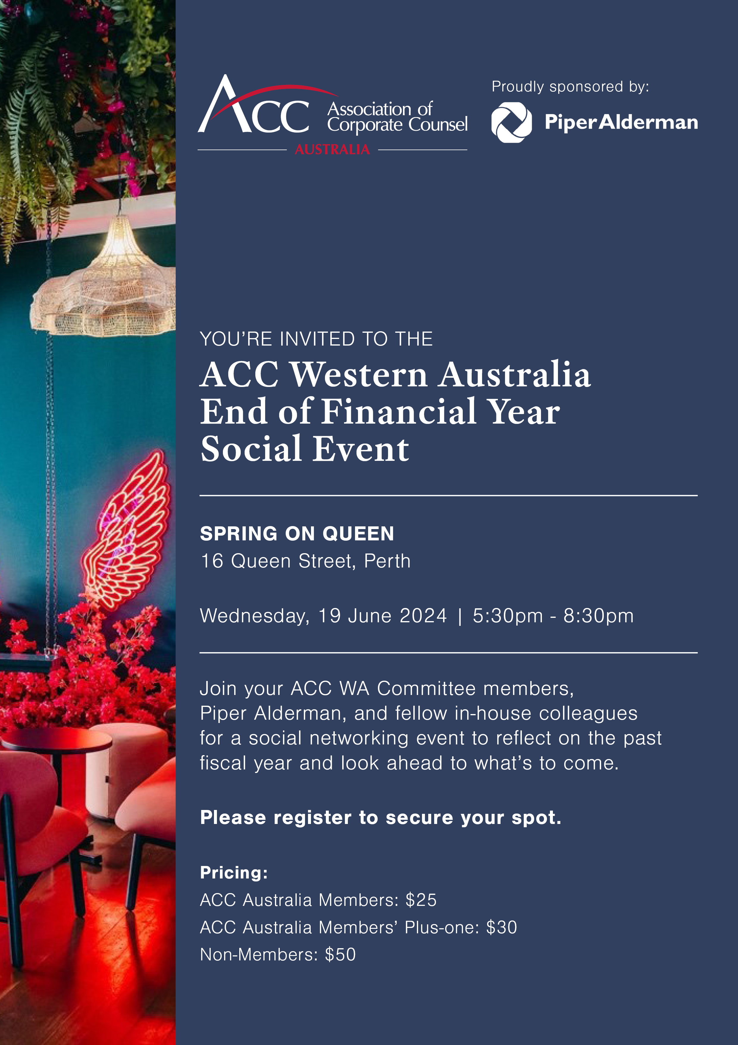 Join your ACC WA Committee members, Piper Alderman, and your fellow in-house colleagues for a social networking event to reflect on the past fiscal year and look ahead to what’s to come on Wednesday, 19 June, 2024, at Spring on Queen.