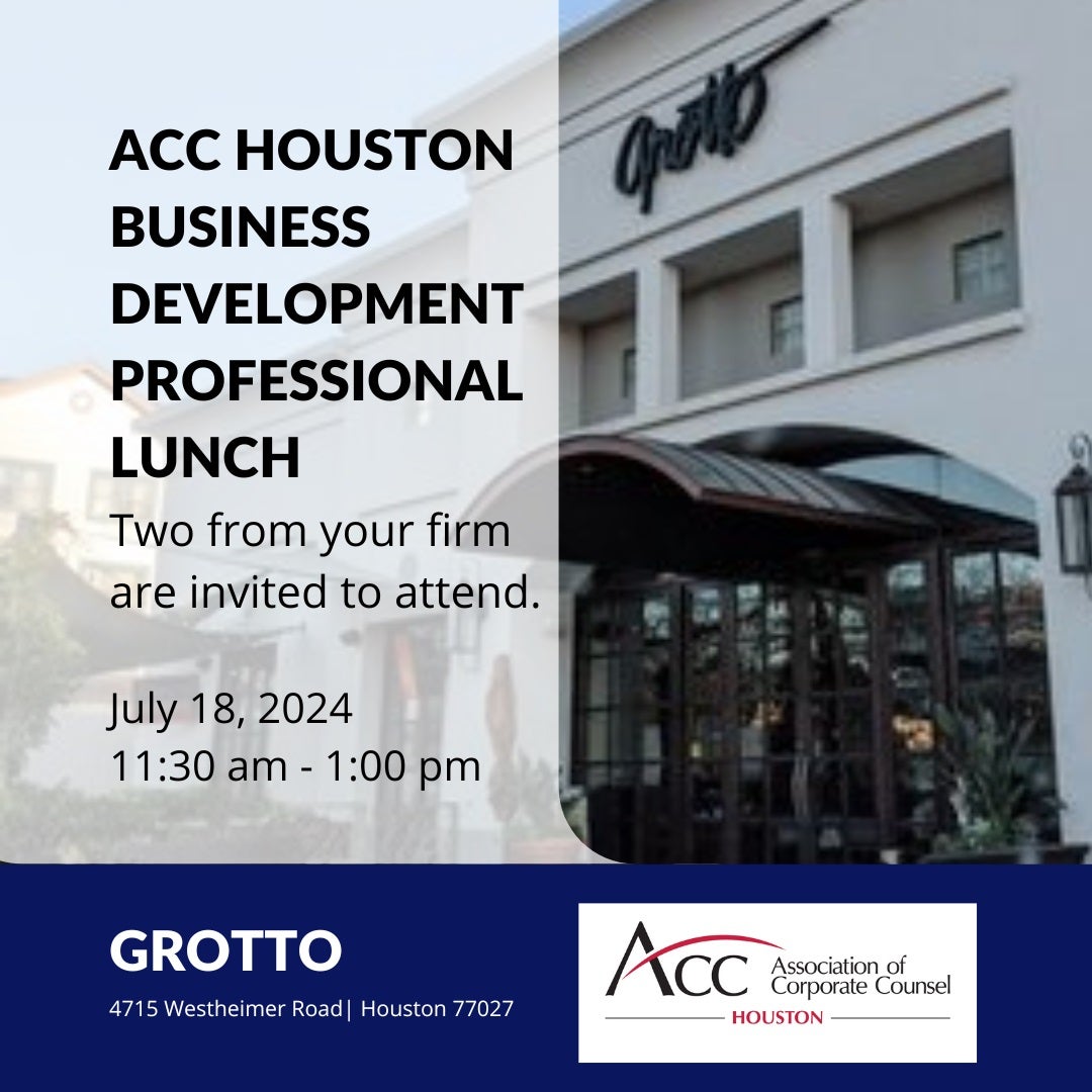 The Association of Corporate Counsel (ACC) is a global bar association that promotes the common professional and business interests of in-house counsel who work for and whose primary responsibility is providing legal advice to corporations, associations and other private-sector organizations. Accordingly, the ACC Houston Chapter reserves the right to limit attendance at any of its Continuing Legal Education (CLE) events to ACC Houston Chapter members or non-ACC chapter member in-house attorneys only. If you are not an in-house attorney and wish to attend a CLE event, you may only do so, space permitting, if you are accompanied by an in-house attorney from your company or organization.