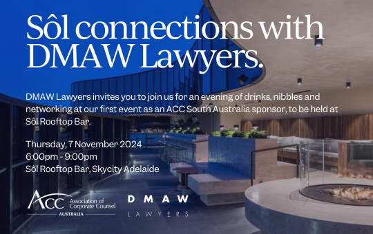 DMAW Lawyers invite you to join us for an evening of drinks, nibbles and networking at our first event as an ACC South Australia sponsor, to be held at Sôl Rooftop Bar.