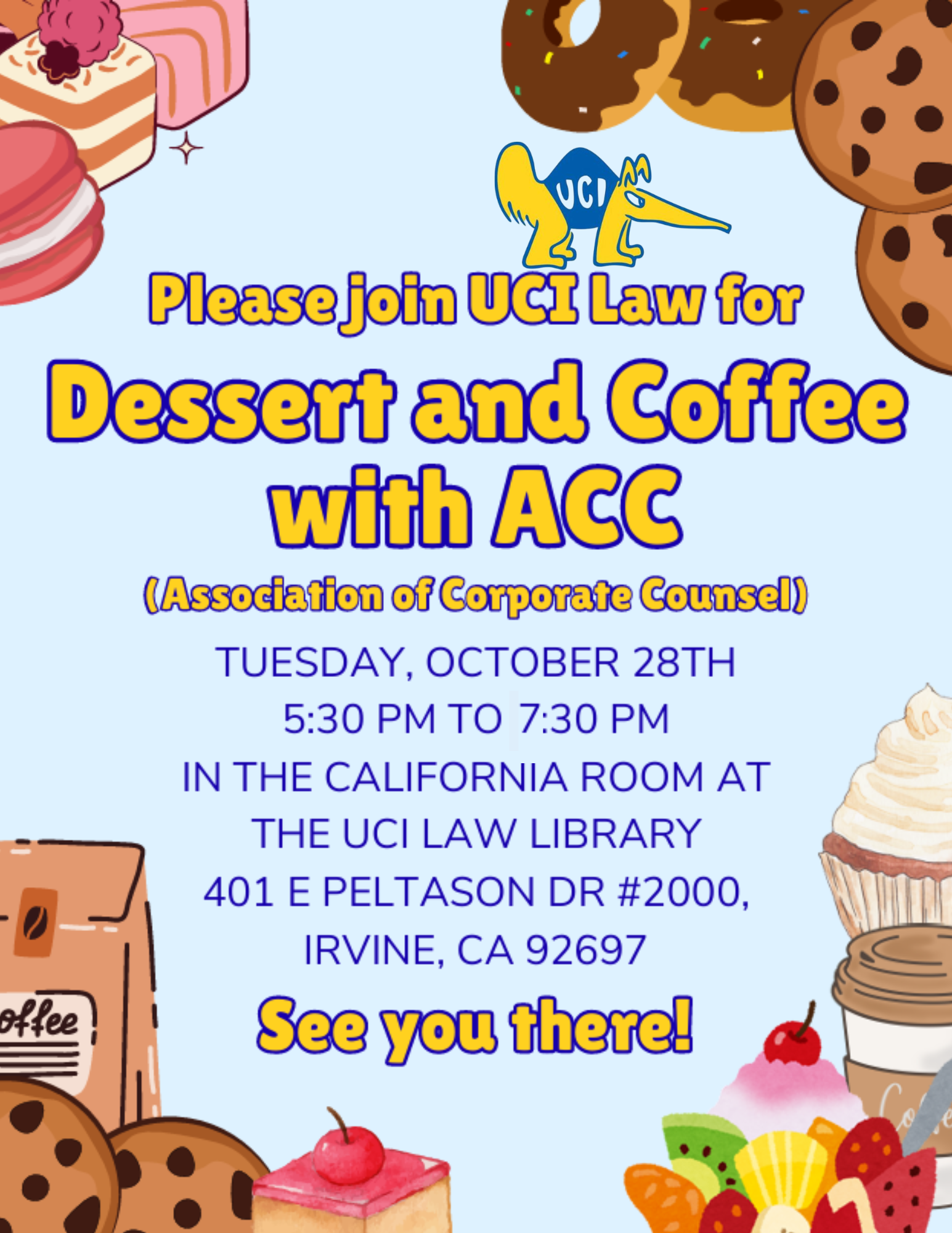 ACC Southern CaliforniaCalling all in-house counsel, come kick back with UCI Law students for an early evening of coffee, desserts, and conversation that’s anything but boring!
