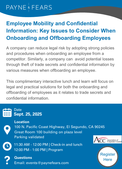 This complimentary interactive lunch and learn will focus on legal and practical solutions for both the onboarding and offboarding of employees as it relates to trade secrets and confidential information.