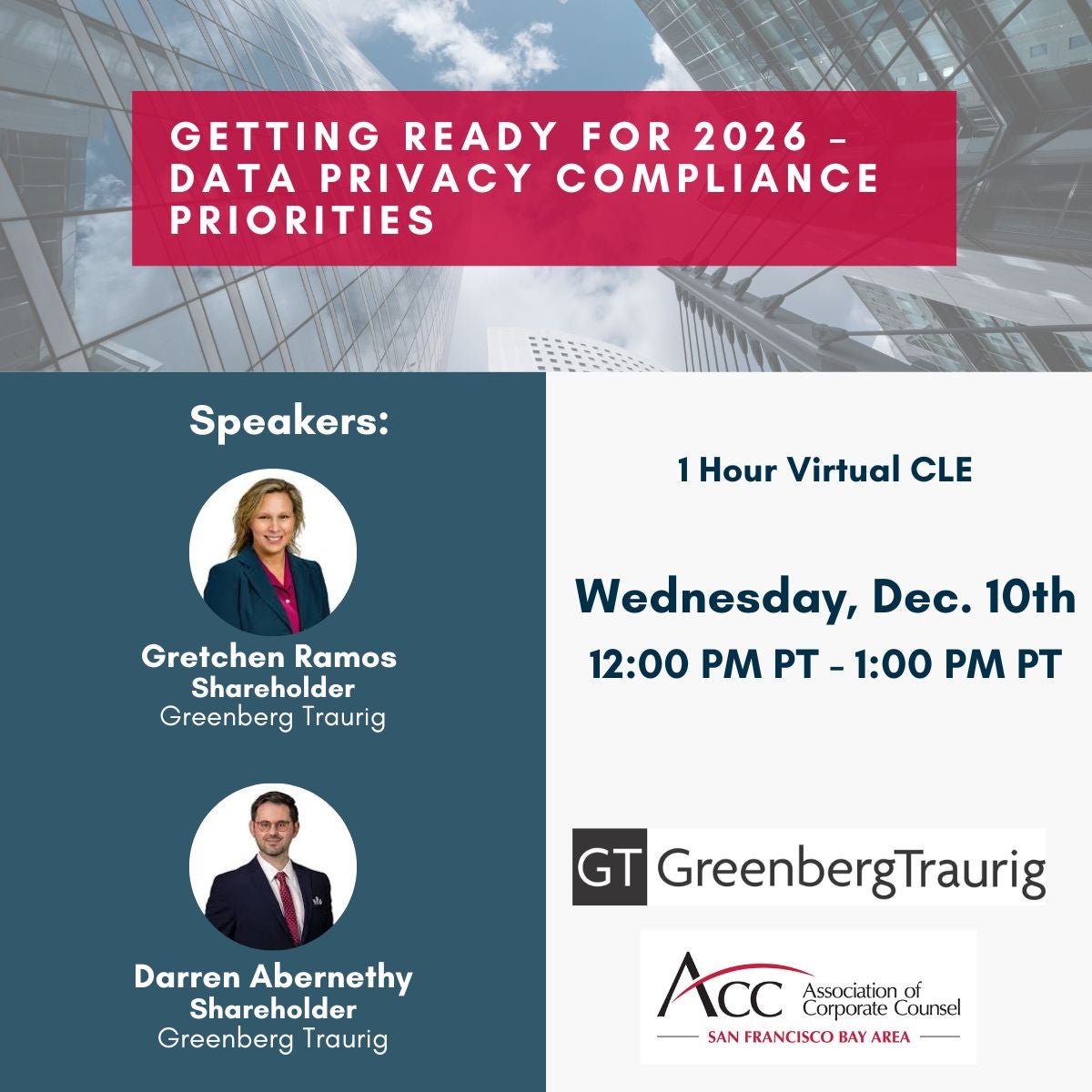 In this 1-hour CLE webinar, Greenberg Traurig privacy specialists, Gretchen Ramos and Darren Abernethy, will review the key activities from this year and read the tea leaves for what in-house counsel teams should expect for next year, with a focus on practical action items for businesses.