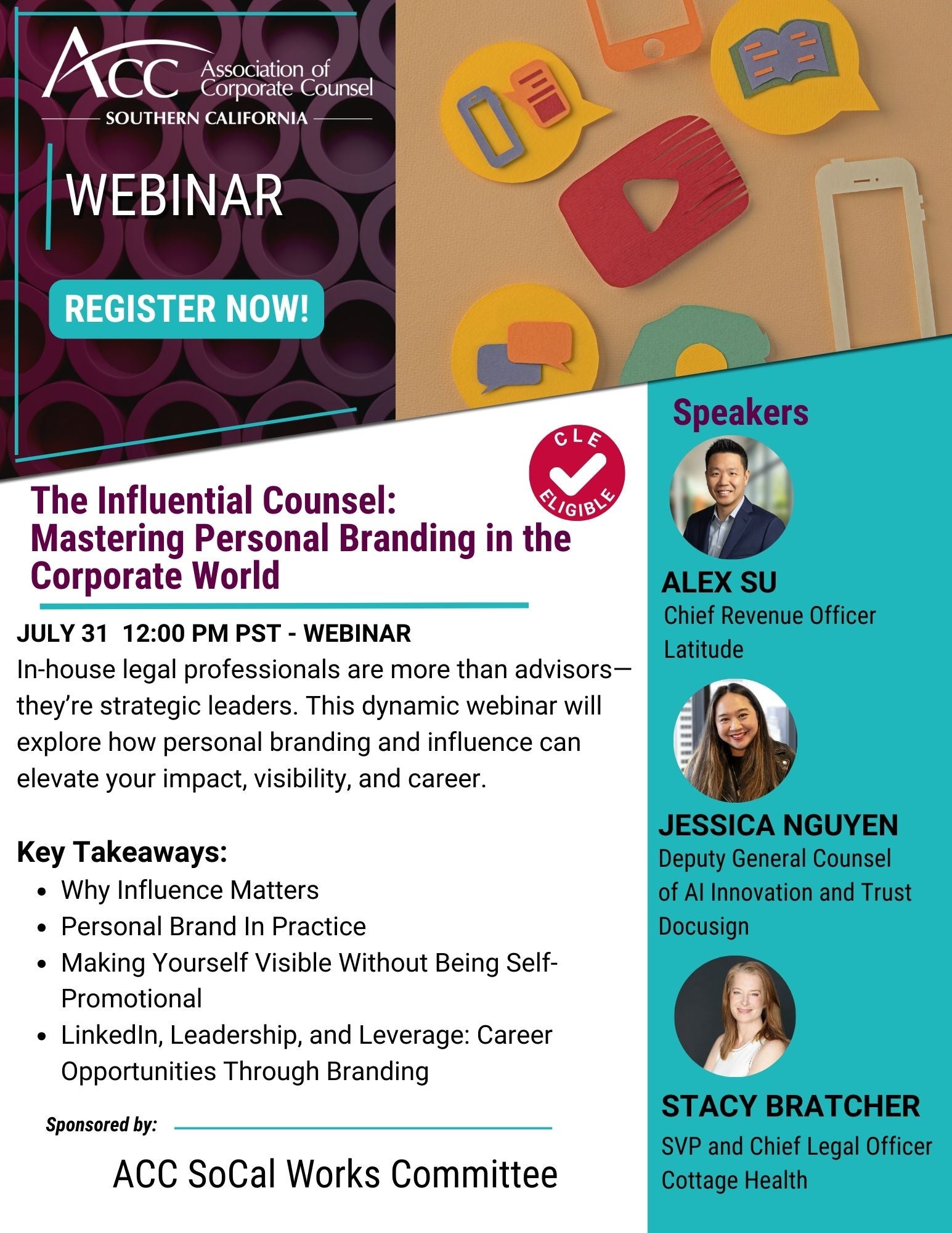 ACC Southern CaliforniaIn-house legal professionals are more than advisors—they’re strategic leaders. This dynamic webinar will explore how personal branding and influence can elevate your impact, visibility, and career. Hear from seasoned legal leaders as they share real-world strategies, lessons learned, and tools for building your brand authentically—both inside your organization and across your network. Whether you're climbing the ladder or looking to lead from where you are, this session will help you position yourself for influence and opportunity.