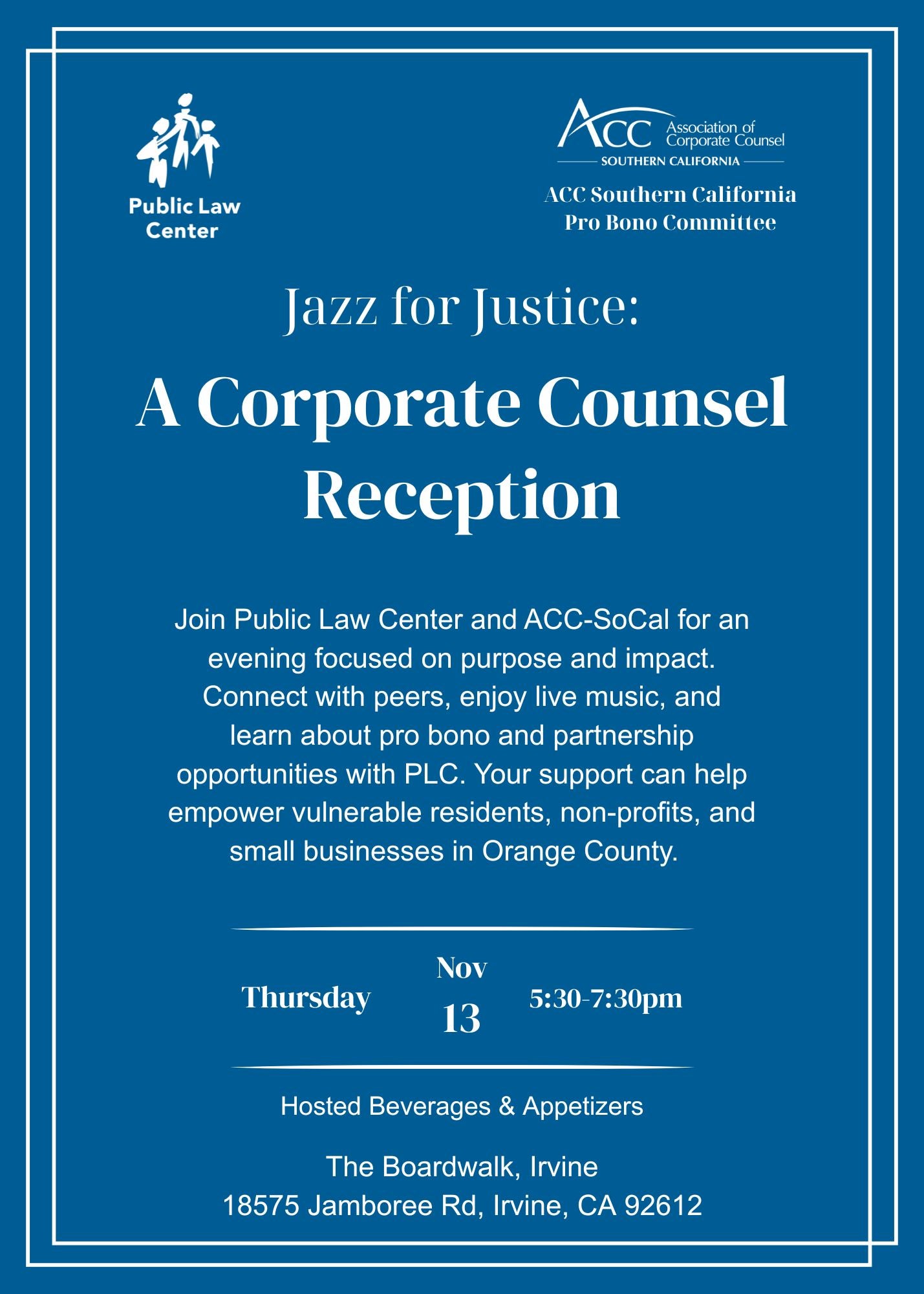 ACC Southern CaliforniaJoin Public Law Center and ACC-SoCal for an evening of connection, live music, and impact. Learn how your support can help empower Orange County residents, non-profits, and small businesses—while enjoying a night of community and purpose.