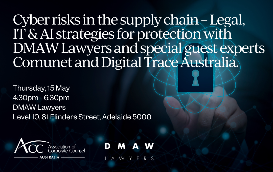 ACC Australia invites you to join us for our exclusive CPD session, Cyber Risks in the Supply Chain – Legal, IT & AI strategies for Protection with our sponsors DMAW Lawyers and special guest experts Comunet and Digital Trace Australia.