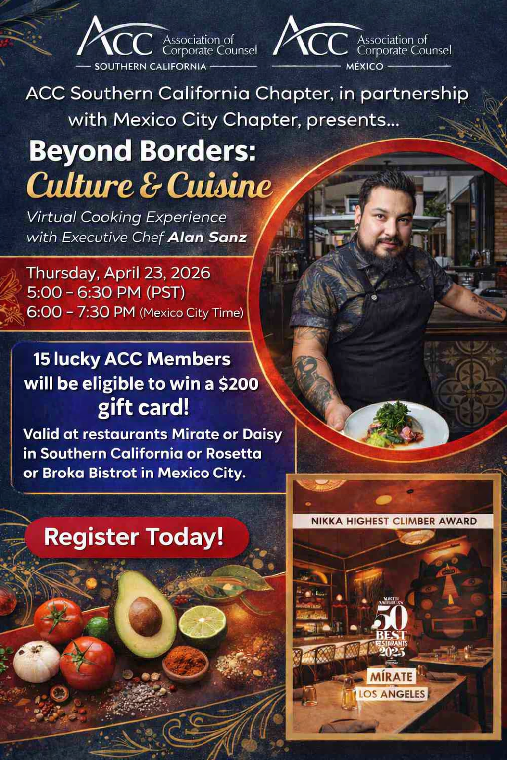 ACC SoCal and ACC Mexico City are thrilled to host our first‑ever collaborative event, Beyond Borders: Culture & Cuisine, featuring a live virtual cooking experience led by Executive Chef Alan Sanz, owner of the acclaimed Southern California restaurants Mirate and Daisy’s, as well as Rosetta and Broka Bistrot in Mexico City.
