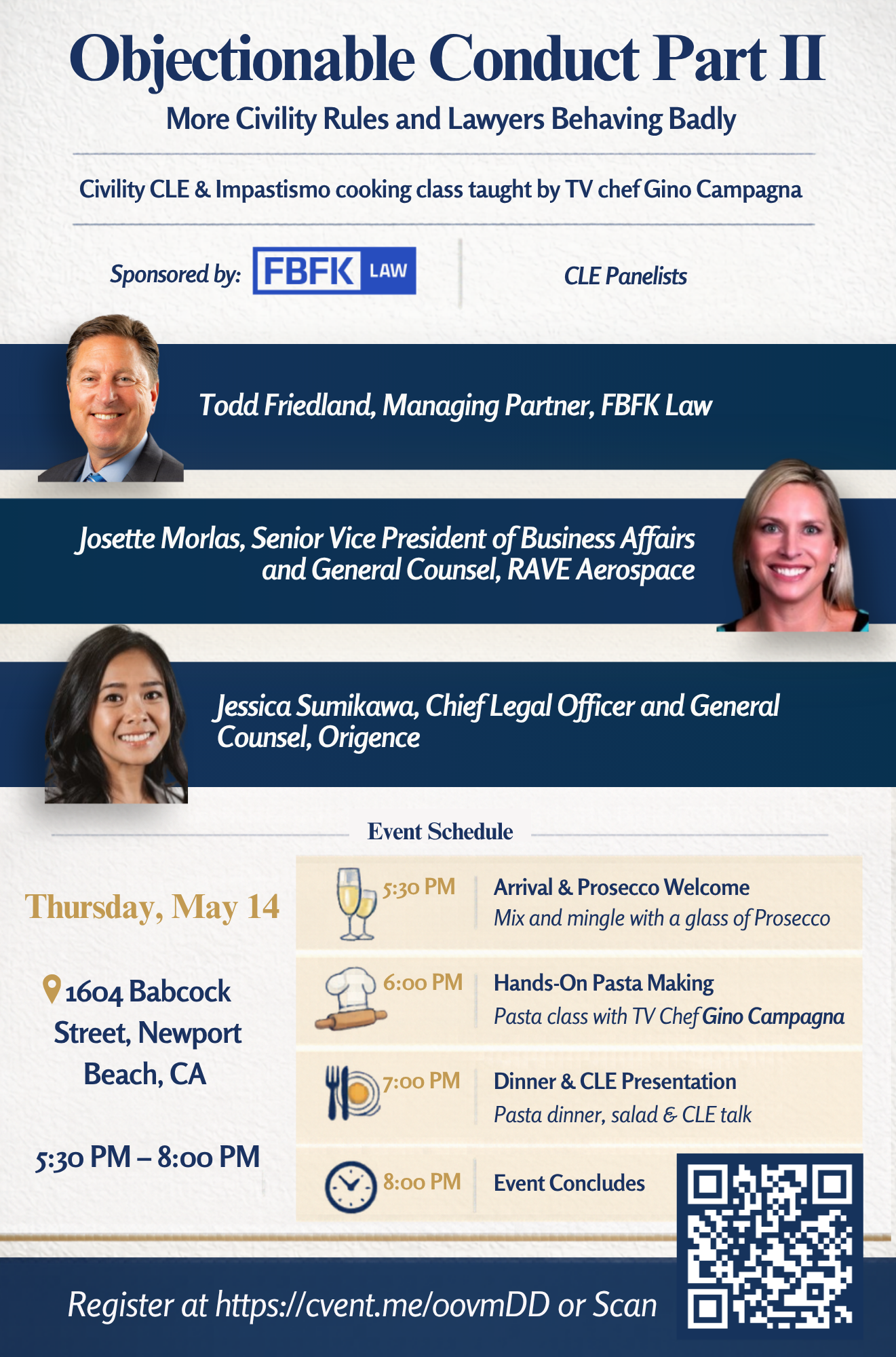 ACC Southern CaliforniaJoin us for an evening that blends professional development with culinary creativity at Counsel & Cooking: Civility CLE (Objectionable Conduct Part II - More Civility Rules and Lawyers Behaving Badly) and Pasta Class with TV Chef Gino Campagna, sponsored by FBFK LAW.