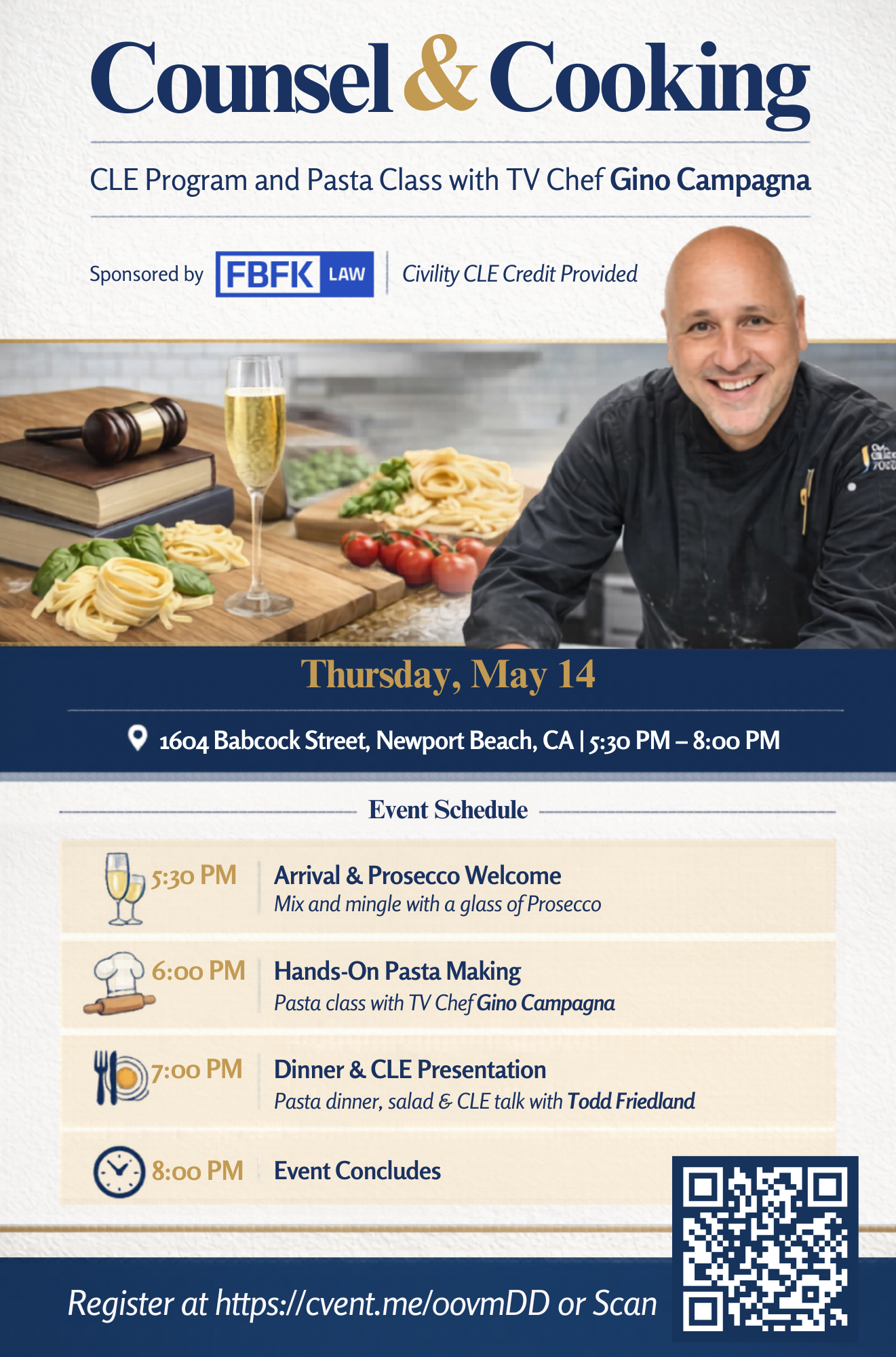 ACC Southern CaliforniaJoin us for an evening that blends professional development with culinary creativity at Counsel & Cooking: Civility CLE and Pasta Class with TV Chef Gino Campagna, sponsored by FBFK LAW.