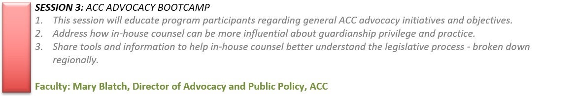 Program graduates will be designated ACC Ambassadors and receive special assignments and enjoy mutual benefits designed to both further their career, and the in-house counsel influence around the world. This program is free, but you must complete an application form to be considered. To receive the application form, and for more information, email m.colby@acc.com.