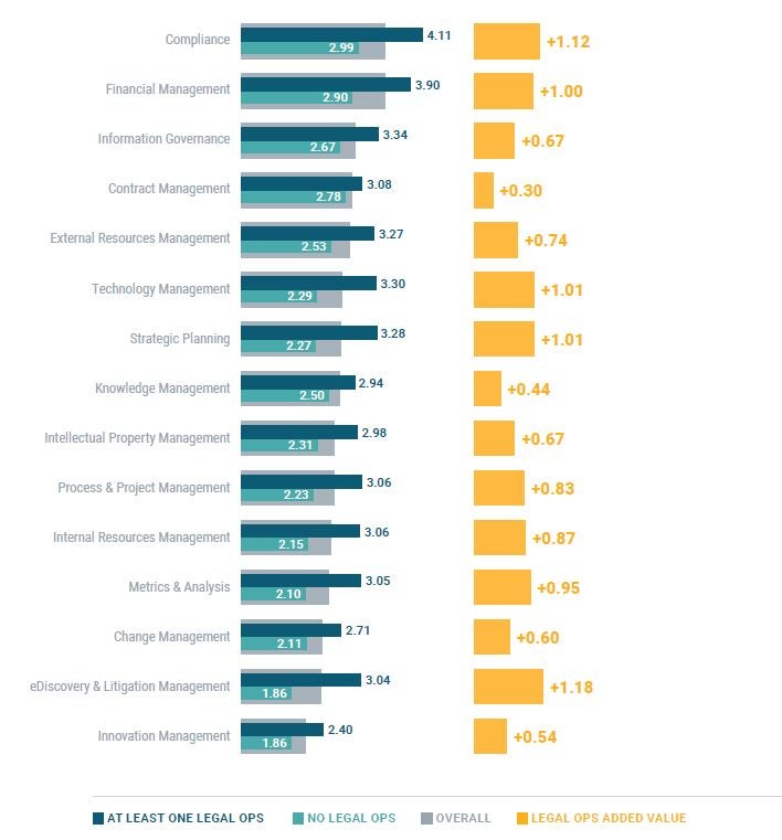 - Detailed results for each of the 15 legal operations functions, including implementation rates for 92 specific policies, practices, and tools.