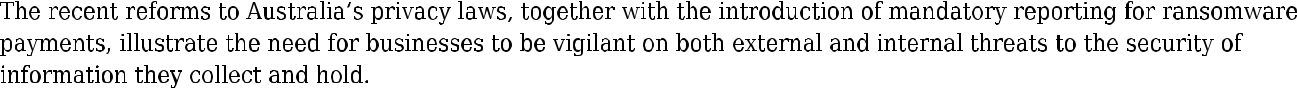 The recent reforms to Australia's privacy laws, together with the introduction of mandatory reporting for ransomware payments, illustrate the need for businesses to be vigilant on both external and internal threats to the security of information they collect and hold.