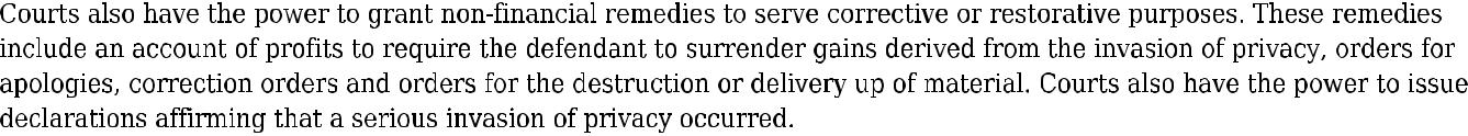 Courts also have the power to grant non-financial remedies to serve corrective or restorative purposes. These remedies include an account of profits to require the defendant to surrender gains derived from the invasion of privacy, orders for apologies, correction orders and orders for the destruction or delivery up of material. Courts also have the power to issue declarations affirming that a serious invasion of privacy occurred.