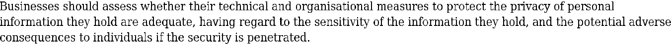 Businesses should assess whether their technical and organisational measures to protect the privacy of personal information they hold are adequate, having regard to the sensitivity of the information they hold, and the potential adverse consequences to individuals if the securityis penetrated.