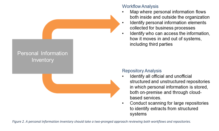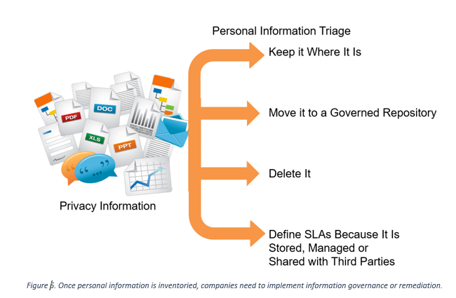 It is likely that the Personal Information Inventory will reveal that personal information resides throughout the enterprise, including in databases, but also in unstructured media including files on desktops and file shares. Companies need to engage in a triage process for this personal information: