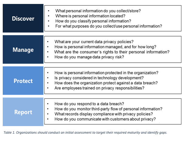 Start with an assessment process that in turn feeds into a program roadmap. Through a high-level interview process, the assessment discovers the types of personal data an organization collects, how it is managed, how it is protected, and the current processes in place to communicate with customers and regulators on privacy compliance, including the reporting of data breaches.