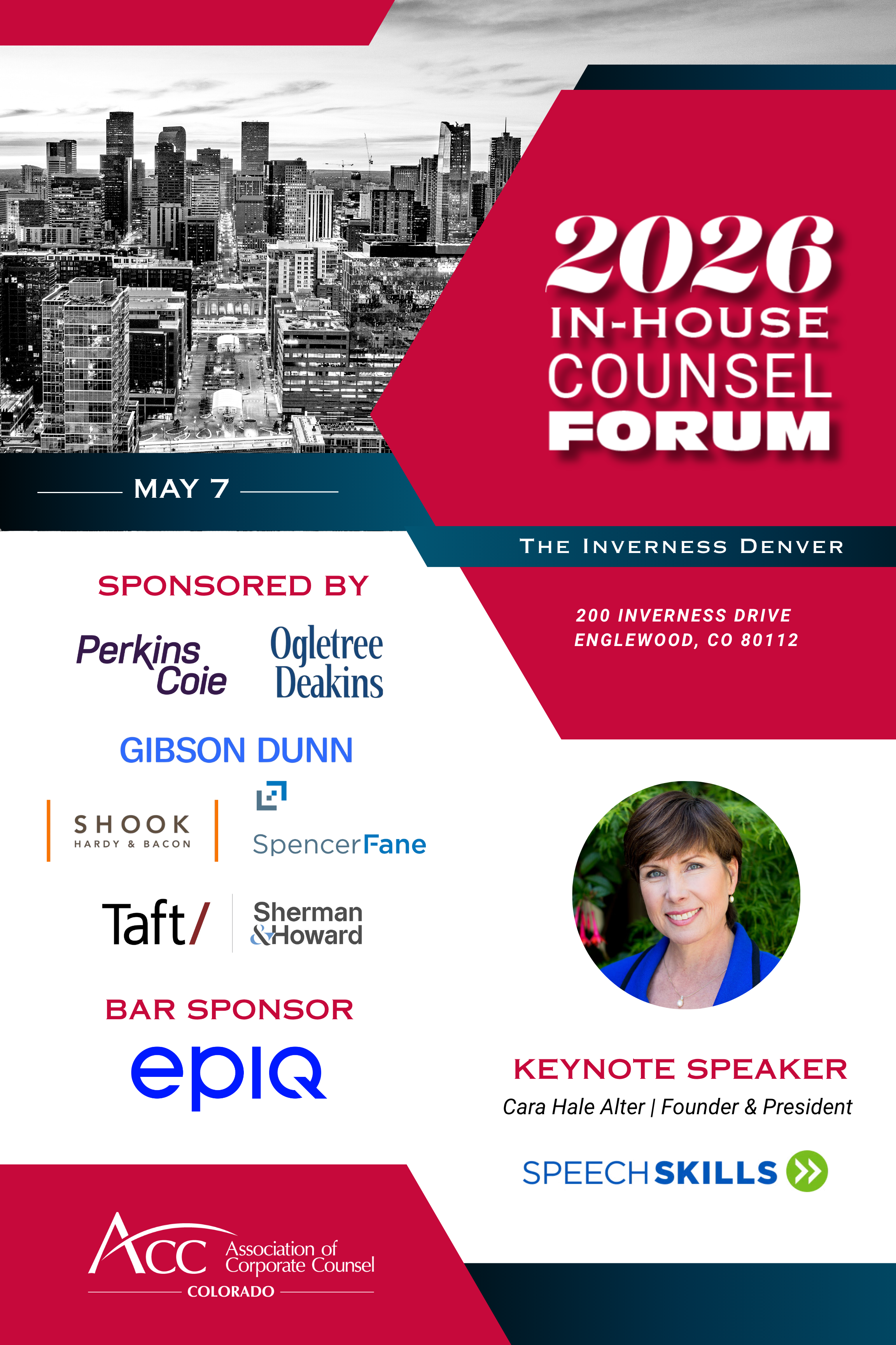 Register for ACC Colorado's IHCF 2026 and join in as the keynote delivers a presentation focused on the unique leadership presence and communication challenges facing career in-house counsel! You will reconnect with your ACC in-house counsel network, generous sponsors, and legal intern placement officers, for a jampacked afternoon of CLE education, serious networking, and a hosted reception!